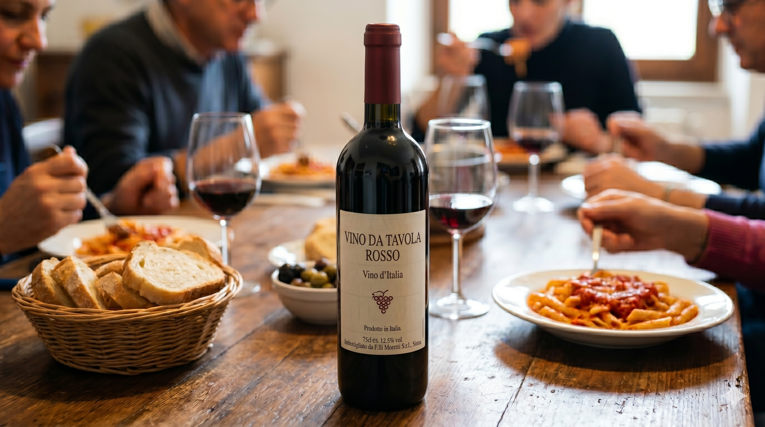 Vino da Tavola (viết tắt: VdT) là tầng thấp nhất — “vang bàn ăn” theo nghĩa đen. Quy định tối thiểu: chỉ cần là vang sản xuất tại Italy. Không yêu cầu ghi vùng cụ thể, không yêu cầu ghi vintage, không quy định giống nho. Nhãn thường chỉ ghi “Vino Rosso” (vang đỏ), “Vino Bianco” (vang trắng) hoặc “Vino Rosato” (vang hồng).